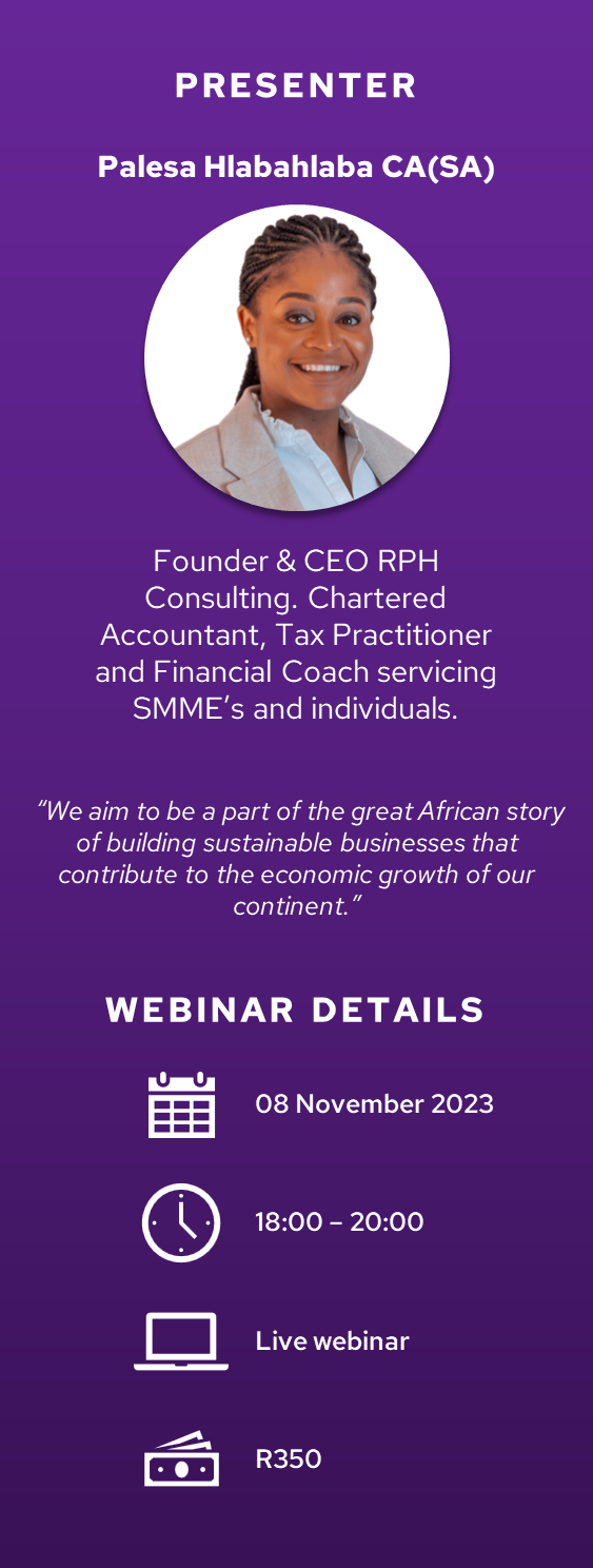 This webinar is intended to provide the basic requirements for statutory compliance of SMMEs operating in South Africa. Business owners operating sole proprietorships, private companies and close corporations will be provided with the necessary insights to enable them to understand compliance requirements, the consequences of non-compliance and the responsibilities that are placed on those charged with governance.