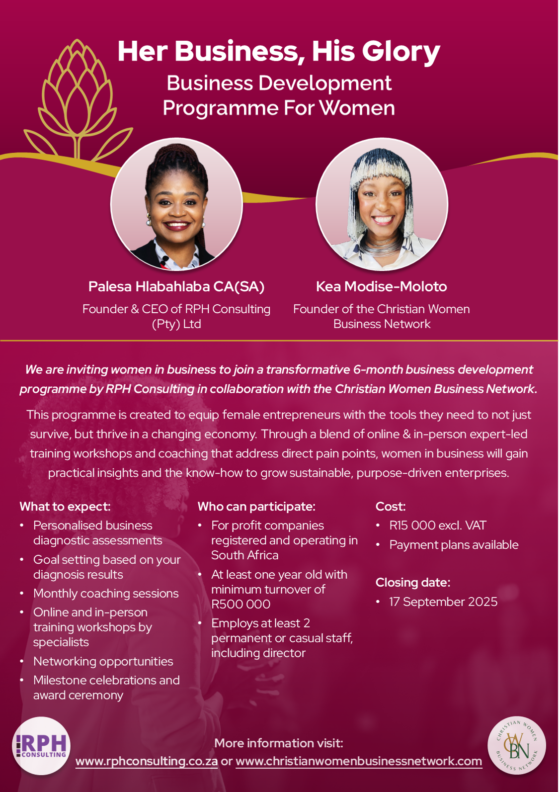 This is where the Her Business, His Glory Business Development Programme for Women comes in, a collaboration between RPH Consulting and the Christian Women Business Network. This programme is designed to help you understand the state of your business, put systems in place, and equip you for stability, growth, and long-term success.